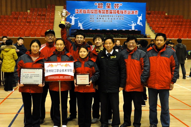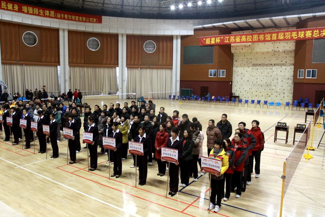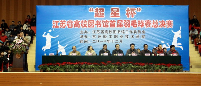 由江蘇省高校圖工委主辦、常州輕工職業技術學院承辦的超星杯江蘇省高校圖書館首屆羽毛球總決賽于20101225在常州輕工職業技術學院體育館拉開帷幕。開幕式由江蘇省高校圖工委隊伍建設與職業素養委員會主任周愛民同志主持。省高校圖工委領導邵波、我校副院長王志平分別致辭。南京理工大學趙敏館長、淮陰師范學院郭啟松館長、金陵科技學院劉阿多館長、南京工業大學趙乃瑄館長及各代表隊領導出席了開幕式,裁判員閆小虎代表全體裁判員宣誓、運動員葉茂代表全體運動員宣誓。本次總決賽是由五個分賽區四十多支隊伍經過激烈選拔,決出十二支優秀的隊伍參加。比賽分為男單、女單、男女混雙3個項目。比賽既為羽毛球運動愛好者提供了切磋球藝的機會,也為高校間交流溝通搭建了平臺。
