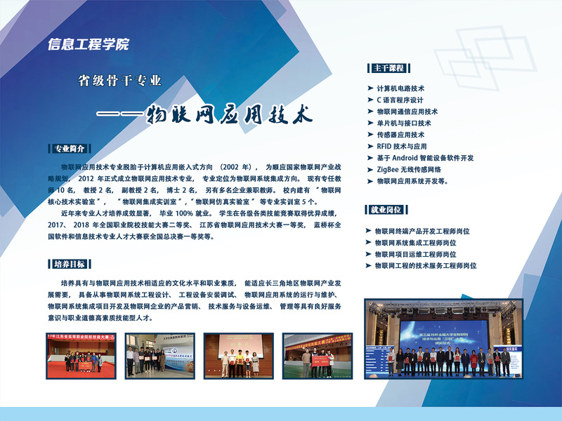 物聯網作為國家倡導的新興戰略性產業,已然成為就業前景廣闊的熱門領域。物聯網應用技術專業,所培養的學生主要就業于與物聯網相關的企業、行業,從事物聯網的通信應用、無線傳感器部署、物聯網系統管理與維護 等工作。現有專業教師17人,高級職稱7人,博士學歷(學位)1人,碩士學歷(學位)15人;所有任職教師均為雙師資質(教師、工程師),有豐富的行業一線從業、從教經驗。同時還聘請20余名企業專家和骨干技術人員作為長期兼職教師, 9名行業專家協助專業建設。校內有“物聯網集成實訓室”、“物聯網核心技術實訓室”、“物聯網仿真實訓室”等5個專業實訓室,校外與多家知名企業合作,共建實習基地。學生在各級各類技能競賽取得優異成績,近年來獲全國職業院校技能大賽二等獎、江蘇省物聯網應用技術大賽一等獎,藍橋杯全國軟件和信息技術專業人才大賽獲全國總決賽一等獎等,畢業生就業率達到100%。