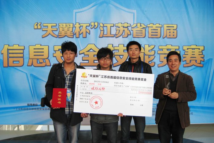 再回到2012年11月的那場大賽。常州輕院信息系派出由董廣東、趙赫、束旋三名同學(xué)組成的團隊,參加省經(jīng)濟和信息化委員會、省教育廳聯(lián)合舉辦的“天翼杯”江蘇省首屆信息安全競賽。全省共有103個網(wǎng)絡(luò)信息安全的團隊參加比賽,隊伍分成兩組:一組是專業(yè)組,成員為省內(nèi)知名的網(wǎng)絡(luò)安全公司人員;另一組是業(yè)余組,成員為省內(nèi)高校(如南京大學(xué)、東南大學(xué)、南京理工大學(xué)、江蘇大學(xué)等高校)大學(xué)生團隊以及社會人員組成的團隊。