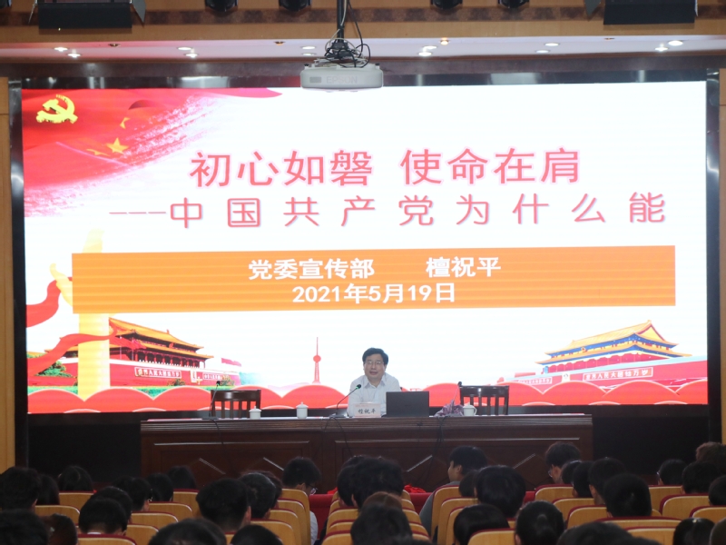 為做好入黨積極分子培養教育工作,不斷吸收優秀入黨積極分子加入黨組織,5月19日下午,學校黨委黨校2021年第1期入黨積極分子培訓班開班。黨委委員、宣傳部部長檀祝平為300余名入黨積極分子上第一講黨史學習教育專題黨課。