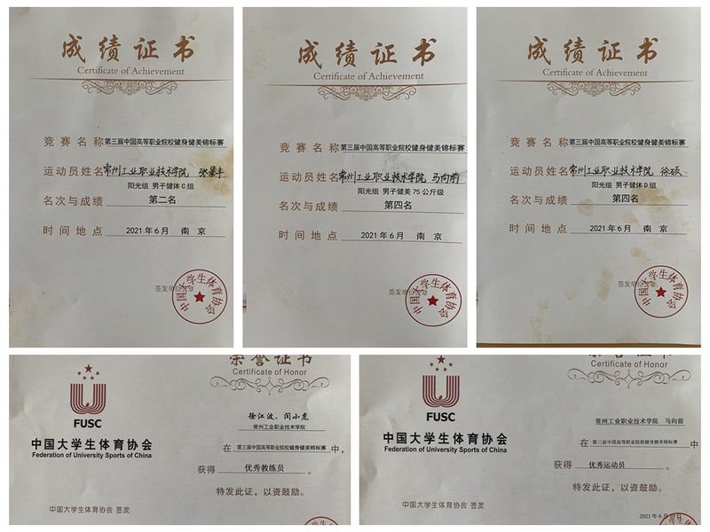 6月19日,由中國大學生體育協(xié)會主辦的第三屆中國高等職業(yè)院校健身健美錦標賽在南京交通職業(yè)技術學院舉行。我校健身健美隊張景豐同學獲男子健體C組亞軍,馬向前同學獲男子健美75公斤級第四名,徐碩同學獲男子健體D組第四名。馬向前同學獲“優(yōu)秀運動員”稱號,徐江波、閆小虎獲“優(yōu)秀教練員”稱號。