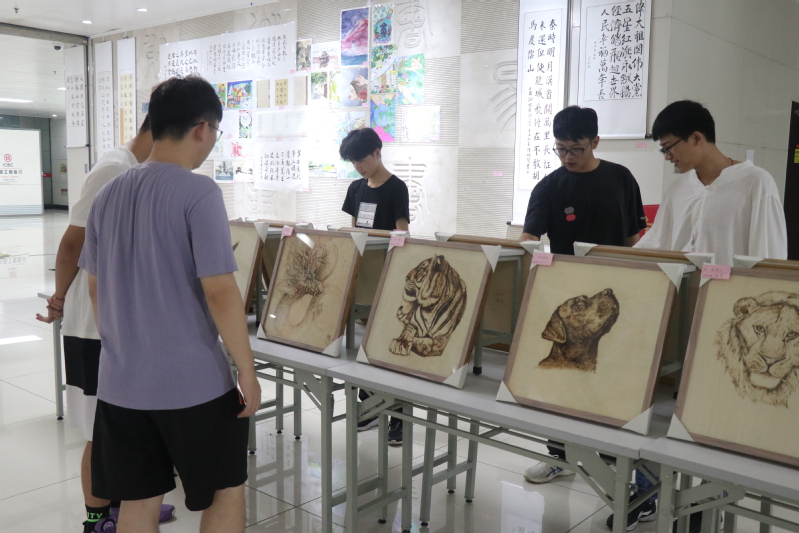 走進寬敞明亮的展覽大廳,撲面而來的翰墨芬芳和丹青美景令人目不暇接。本次書畫展主要包含初心向黨、英雄禮贊、美麗中國、青春之歌四個展區,師生作品超過百幅,呈現了書法、水彩、烙畫、刻紙、攝影、手工、3D打印技術等多種藝術形式。