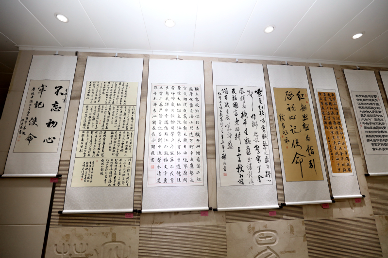 在“初心向黨”展區,謝飛老師的書法作品《嘹亮紅歌唱黨聽》,以渾厚、蒼勁、老練的筆觸書寫了對黨和國家的深切熱愛;孫愛民老師的書法作品《不忘初心、牢記使命》,表現了在中國共產黨的堅強領導下,全國人民攜手共進,實現中華民族偉大復興的中國夢的信心;書法協會負責人魏靈水老師的作品《清平樂·六盤山》,用流暢的筆墨展現了毛澤東主席對中國革命前途的信心和希望;王正華老師的書法作品《沁園春·長沙》、徐自明老師的書法作品《紅船思想為指引啟初心記使命》、李劉麗老師的書法作品《水調歌頭·明月幾時有》都以書法寄情,用遒勁的筆法訴說著濃濃的愛國之情。
