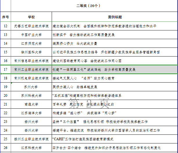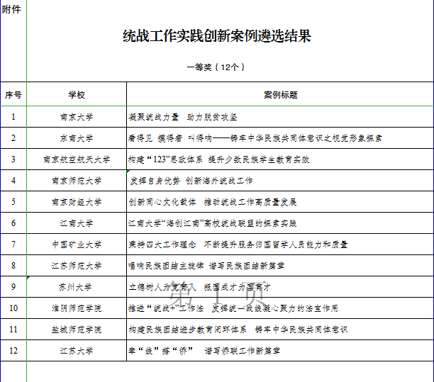 近日,江蘇省委教育工委面向全省高校開展了“同心向黨·教育有我”統戰工作實踐創新案例征集。經學校申報、專家評審,全省最終遴選出68個優秀創新案例,其中一等獎12個、二等獎26 個、三等獎30個。我校黨委統戰部報送的《創建“一體兩翼三化”統戰陣地 助力學校高質量發展》案例榮獲二等獎,實現統戰工作歷史性突破。