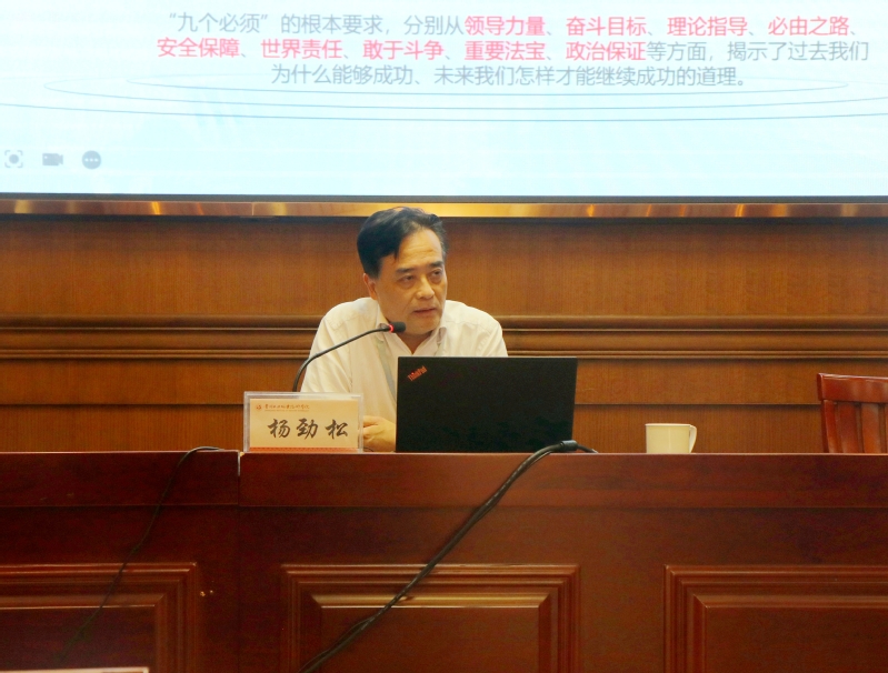 楊勁松以《百年大黨百年行,繼往開來擔使命——全面學習領會習近平總書記“七一”重要講話精神》為題,從“一個莊嚴宣告——中華大地全面建成小康社會”“一個鮮明主題——實現中華民族偉大復興”“一幅壯麗史詩——闡述四個歷史時期偉大成就”“一種精神——深刻領會偉大建黨精神”“一組號召——深刻把握以史為鑒、開創未來的‘九個必須’”“一篇光輝的文獻——深刻認識‘七一’重要講話偉大意義”“一份擔當——重塑中國、改變世界”七個層面對習近平總書記“七一”重要講話精神進行了深入闡述。
