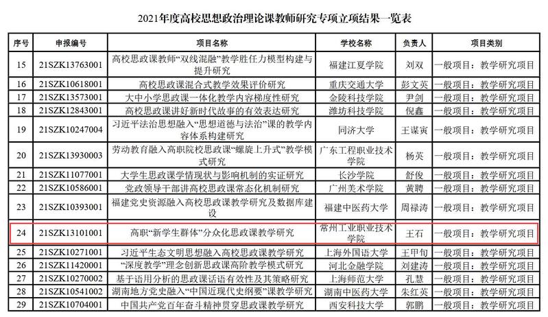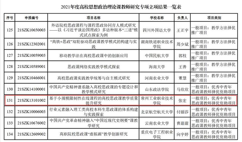 近日,教育部社科司傳來喜訊,在全國(guó)2021年度高校思想政治理論課教師研究專項(xiàng)169項(xiàng)立項(xiàng)項(xiàng)目中,我校馬克思主義學(xué)院王石、張宏兩位老師申報(bào)項(xiàng)目位列其中。在此全國(guó)所有高校參與角逐的研究項(xiàng)目中,只有40個(gè)高職院校項(xiàng)目立項(xiàng),一所高職院校獨(dú)中2項(xiàng)極其罕見。