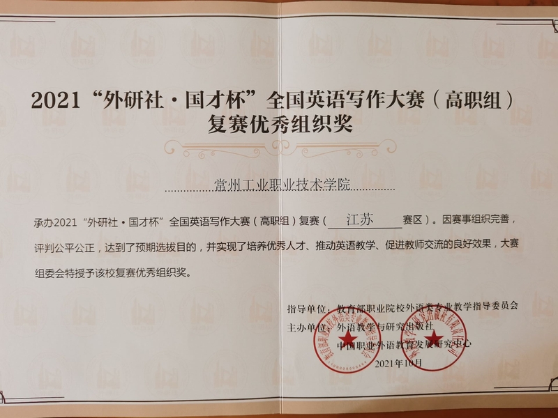 2021年10月31日,2021“外研社·國才杯”全國英語寫作大賽(高職組)江蘇賽區比賽在我校舉辦。來自全省67所學校的152名選手同場競技,以扎實的語言基本功、卓越的英語寫作能力展現當代大學生的風采。我校參賽選手在比賽中獲佳績,三名選手參賽,兩名獲一等獎,一名獲三等獎。我校被大賽組委會授予“復賽優秀組織獎”。