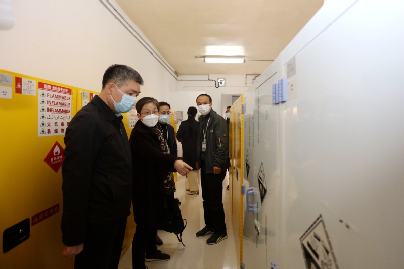 陳正春一行實地查看了我校材料工程學院實驗室及危化品倉庫,了解了我校危化品管理條例、化學實驗室管理制度,現場仔細查看了危化品的存儲、使用、廢棄和安全保障措施等情況,詢問了實驗室人員的危化品保管常識。陳正春對我校危化品安全管理工作表示肯定,他強調要高度重視實驗室危化品的管理工作, 提高認識、加強監管、落實措施、確保安全。