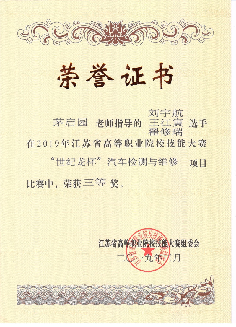 學生積極參加各類技能技術比賽,獲得江蘇省職業院校技能大賽“汽車技術”賽項19年、20年三等獎。