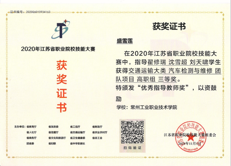盛雪蓮老師獲得江蘇省職業院校技能大賽優秀指導教師獎