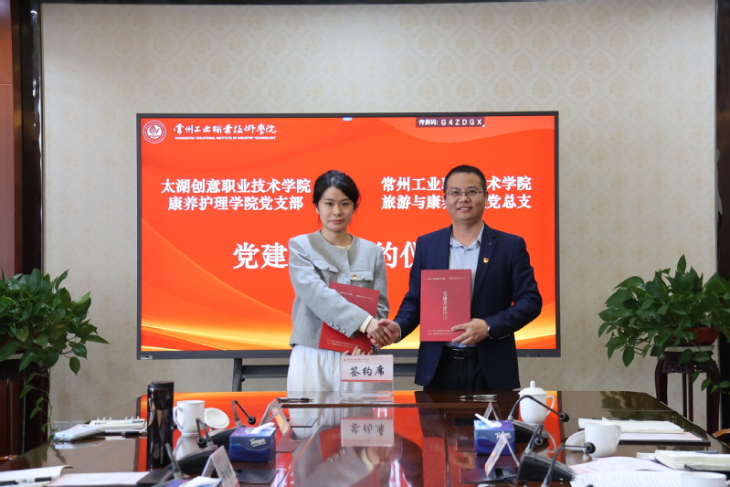 簽約儀式上,席海濤與壯國楨簽署兩校黨委黨建結對共建協議,我校旅游與康養學院黨總支書記王迎春與太湖創意職業技術學院康養護理學院黨支部副書記陳詩雨簽署黨總支共建協議。