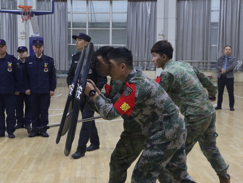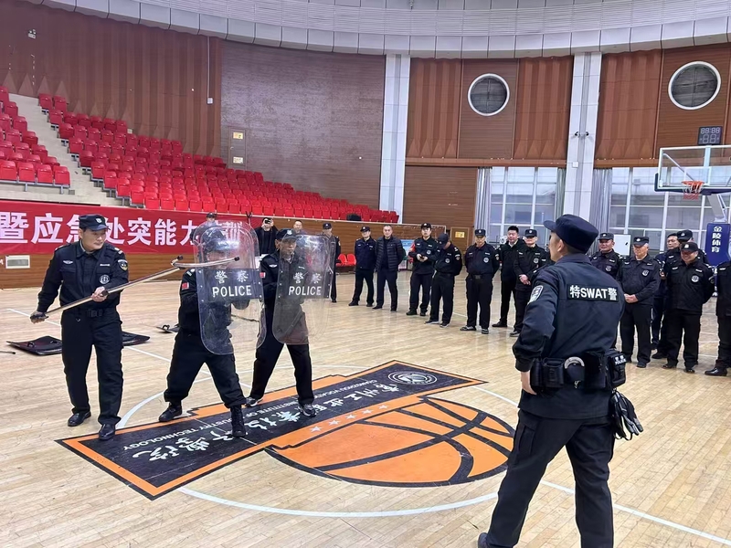 常州市公安局武進分局巡特警大隊是我校黨建共建單位、“校地平安聯盟”成員單位。本次培訓特邀常州市公安機關警務技戰術優秀教官、武進分局特巡警大隊沈飛,為科教城6所高校安保人員進行培訓。演練前,沈飛結合自身處置突發事件經驗,詳細介紹了反恐防暴應急演練相關必備知識,以及面對突發事件的應急處置和自我保護措施。隨后,沈飛及隨行干警就如何應對暴力及沖撞事件進行針對性培訓,向大家現場演示了防暴盾牌、鋼叉、防暴棍、鎖腿器等常用防衛器械的正確使用方法、盾叉三人組作戰技術以及應對突發事件的應急處置技能,幫助大家正確掌握使用器械的要領。最后,通過現場指導,安保人員進行作戰訓練和防暴恐現場模擬對抗。