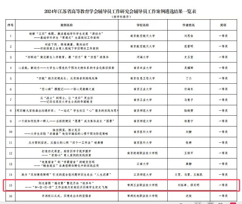 1月20日,在江蘇省高等教育學會輔導員工作研究會發布的《2024年江蘇省高等教育學會輔導員工作研究會輔導員工作案例遴選結果的通知》中,我校劉裕章、繆雙明老師的案例《陽光普照“揭迷霧” 繁花盡染“桃李年”——“知-信-行-傳”工作法助力家庭經濟困難學生逆光飛翔》榮獲2024年輔導員工作案例一等獎。這是我校參與江蘇省高等教育學會輔導員工作案例評選以來首次獲得一等獎,輔導員工作案例評獎取得歷史性突破。