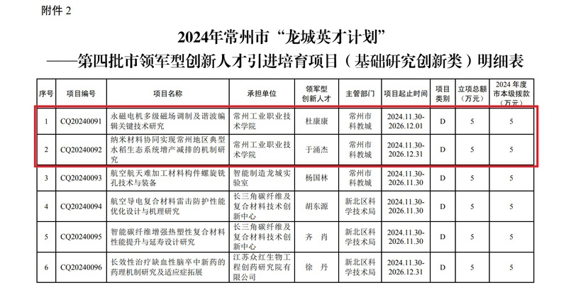 近日,常州市發布2024年“龍城英才計劃”第四批領軍型創新人才引進培育項目立項名單。我校材料工程學院于涌杰博士和智能控制學院杜康康博士雙項目入選基礎研究創新類項目,是常州市本年度唯一獲該項目立項的高職院校,我校也成為全市連續兩年斬獲該項目的高職院校。此次入選,標志著我校在高層次人才引培、高水平團隊建設方面取得了又一次突破。