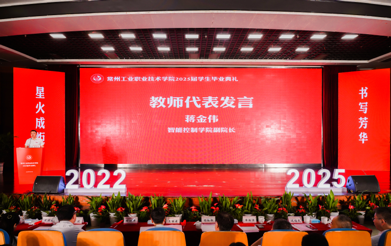 智能控制學院蔣金偉老師作為教師代表深情寄語畢業生。他希望畢業生永葆對專業的熱愛之心,以“茍日新,日日新”的姿態,緊跟時代發展的步伐,在技術浪潮中勇立潮頭,以向陽而生的姿態,在人生的舞臺上綻放璀璨光芒。