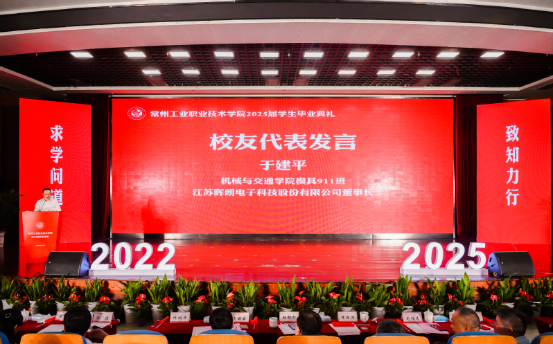 機械與交通學院1995屆模具911班畢業生、江蘇暉朗電子科技股份有限公司總經理于建平作為校友代表向學弟學妹們講述了自己畢業三十年的奮斗歷程。他希望學弟學妹們以“金品”鑄魂,以“金技”立身,以“金創”破界,以“金諾”致遠,以“金暉”報國,讓青春在制造強國的星辰大海中閃光。