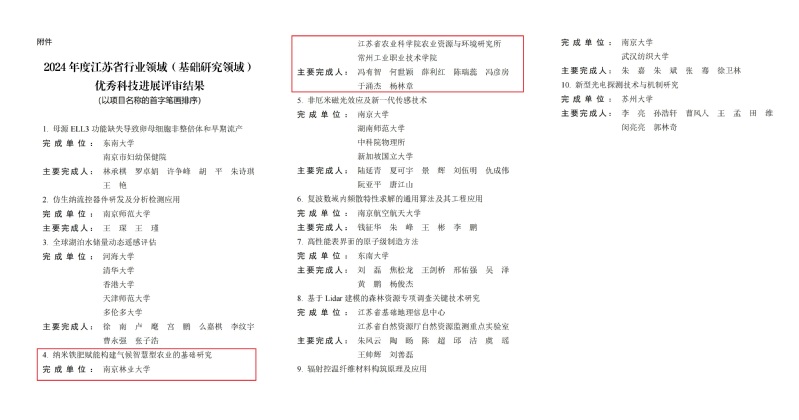 近日,江蘇省科協(xié)公布了“2024年度江蘇省行業(yè)領(lǐng)域十大科技進展”成果名單。由我校材料工程學(xué)院于涌杰博士(2025年江蘇省“青藍工程”中青年學(xué)術(shù)帶頭人)聯(lián)合南京林業(yè)大學(xué)、江蘇省農(nóng)科院申報的“納米鐵肥賦能構(gòu)建氣候智慧型農(nóng)業(yè)的基礎(chǔ)研究”入選“2024年度江蘇省行業(yè)領(lǐng)域(基礎(chǔ)研究領(lǐng)域)十大科技進展”,并榮獲優(yōu)秀科技進展。該成果是繼團隊獲批國家自然科學(xué)基金面上項目及在《Nature Sustainability》發(fā)表開創(chuàng)性論文后的又一重大突破。