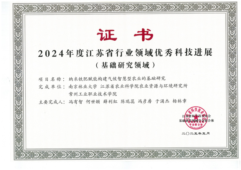 近日,江蘇省科協公布了“2024年度江蘇省行業領域十大科技進展”成果名單。我校材料工程學院于涌杰博士(2025年江蘇省“青藍工程”中青年學術帶頭人)聯合南京林業大學、江蘇省農科院申報了“納米鐵肥賦能構建氣候智慧型農業的基礎研究”入選2024年度江蘇省行業領域(基礎研究領域)十大科技進展,并榮獲優秀科技進展。該成果是繼團隊獲批國家自然科學基金面上項目及在《Nature Sustainability》發表開創性論文后的又一重大突破。