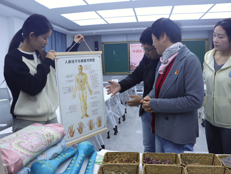 活動現場,本草社學生向三位老同志展示了自主研發的中藥養生錘、中藥枕、中藥香皂和艾草貼等文創產品。學生結合人體經絡圖,詳細講解了艾草、薰衣草等藥材的配伍原理及功效,現場演示穴位按摩手法。張燏試用中藥養生錘后,對學生的創新設計給予高度評價:“將傳統藥材與現代工藝結合,既弘揚了中醫藥文化,又體現了青年學子的實踐智慧。”金華仁和趙呂明還與學生互動體驗了辨識藥材、調配藥材比例等環節,感受“藥食同源”的文化魅力。三位老同志分別與家庭困難學生結對幫扶,現場互留聯系方式。三位老同志結合自身經歷,勉勵學生扎根專業、服務社會。
