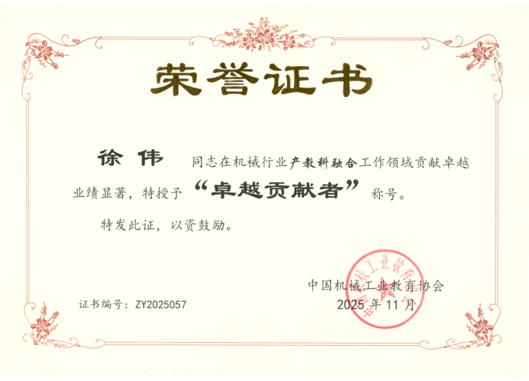 近日,在中國機械工業教育協會組織的機械行業產教科融合高質量發展評選中,我校褚守云、徐偉兩位教授憑借在產教融合領域的深耕實踐與突出成就,榮獲機械行業產教科融合工作“卓越貢獻者”稱號,為我校高水平建設再添重要榮譽。