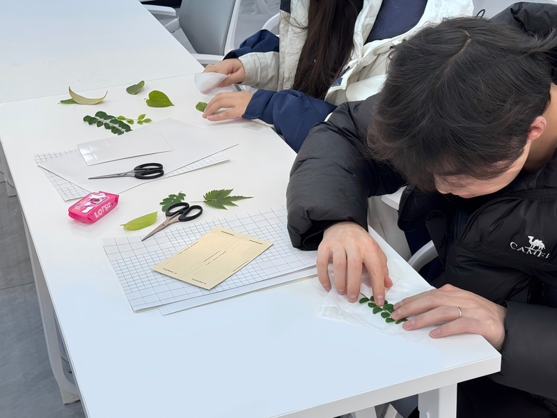 活動通過“樹木資源”主題科普分享,帶領大家認識植物多樣性,理解樹木資源在生態系統中的重要作用。現場氣氛活躍,同學們以落葉與枯枝為素材,動手DIY“落紅書簽”——將不同形態的葉片拼貼組合,并配以詩意短句,將自然之美定格于方寸書頁之間。從素材的精心挑選到書簽的最終封裝,大家在實踐中親近自然、感悟自然,深化了對“低碳利用自然物”理念的理解,不少作品展現了獨特的美學視角與巧妙構思。同學們表示,此次活動以趣味手工為載體,一改傳統環保宣傳的單一模式,不僅提升了創造力和動手能力,更讓環保理念以生動可感的方式融入日常生活。