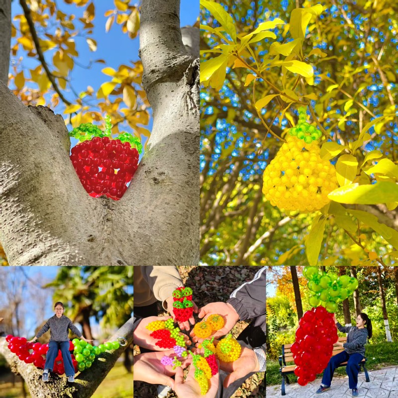 活動當(dāng)天,新手在社團(tuán)骨干的指導(dǎo)下掌握“十字穿珠法”,熟練者則挑戰(zhàn)“立體疊編”技法,零散的彩珠在指尖化作鮮活的“果蔬藝術(shù)品”。更有創(chuàng)意之作將串珠果蔬串聯(lián)成掛飾或擺件,置于校園秋景中,與黃葉藍(lán)天相映成趣,成為“秋日限定風(fēng)景”。