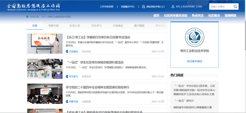 自2025年3月我校獲評全國高校示范“一站式”學生社區以來,學校高度重視學生社區建設工作,始終以習近平新時代中國特色社會主義思想為指導,構建黨建引領、隊伍入駐、學生參與、文化浸潤、數字賦能的“五位一體”工作體系,推動育人資源集聚、思政力量下沉,努力打造協同育人的新格局。學校以黨建引領筑牢根基,將黨建工作延伸至社區,落實校院領導“一線規則”,深入踐行師生“同吃同住同成長”理念;以“守望·常工業”為核心理念,構建“工匠精神+感恩知責”的社區文化浸潤體系,打造了“求是、同行、金盾、樂己、永助、戎光、禮耀”等一系列品牌項目;在治理服務方面提質增效,建立了學生訴求線上反饋機制,搭建自主管理網格與學生自治組織,打造社區朋輩育人陣地。