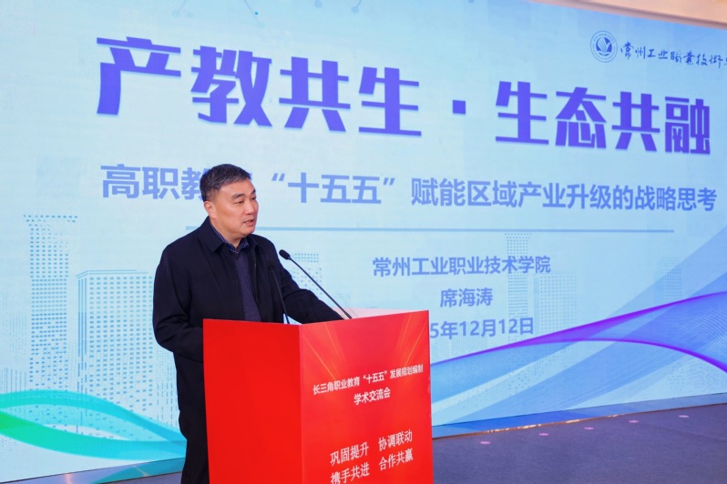 在主旨報(bào)告環(huán)節(jié),我校黨委書(shū)記席海濤作為長(zhǎng)三角地區(qū)江蘇高職院校代表,作《產(chǎn)教共生·生態(tài)共融——高職教育“十五五”賦能區(qū)域產(chǎn)業(yè)升級(jí)的戰(zhàn)略思考》專(zhuān)題報(bào)告。他指出,“十五五”時(shí)期高職教育的核心使命在于緊密對(duì)接《教育強(qiáng)國(guó)建設(shè)規(guī)劃綱要(2024-2035年)》文件要求,成為服務(wù)新質(zhì)生產(chǎn)力發(fā)展的“主基地”、促進(jìn)更高質(zhì)量就業(yè)的“穩(wěn)定器”、構(gòu)建融通融合體系的“立交橋”、教育教學(xué)化轉(zhuǎn)型的“先行區(qū)”以及服務(wù)國(guó)家戰(zhàn)略的“助推器”。他通過(guò)對(duì)比長(zhǎng)三角、粵港澳大灣區(qū)、京津冀等三大城市群數(shù)據(jù),展現(xiàn)了長(zhǎng)三角地區(qū)雄厚的產(chǎn)業(yè)基礎(chǔ)與活躍的經(jīng)濟(jì)動(dòng)能,特別是江蘇高校資源豐富和一流企業(yè)集群的顯著優(yōu)勢(shì)。