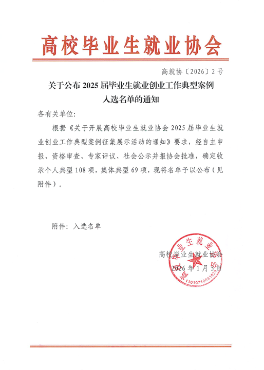 近日,高校畢業生就業協會發布2025屆畢業生就業創業工作典型案例入選名單。此次評選共遴選出全國個人典型108項、集體典型69項,我校2項個人典型案例和1項集體典型案例成功入選。