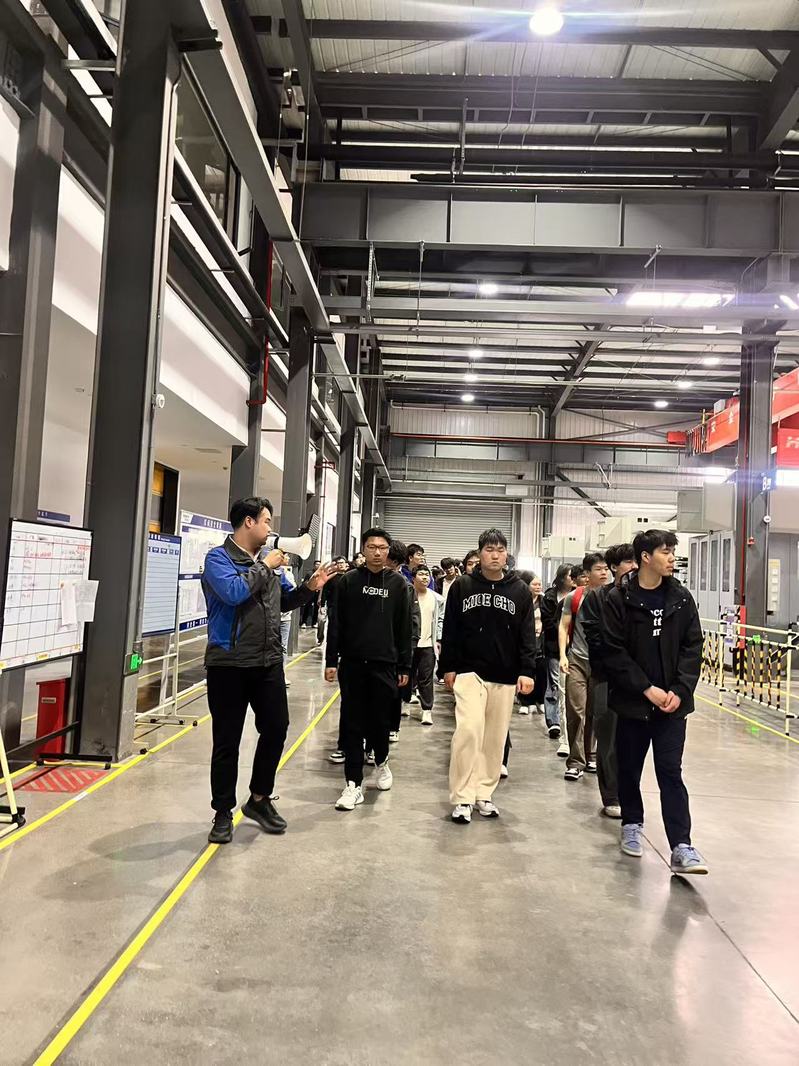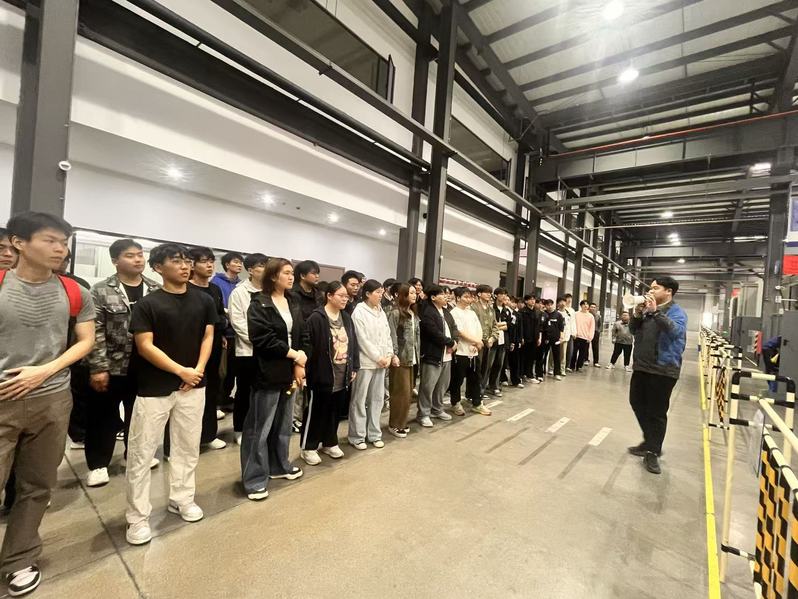 研學現場,企業工作人員熱情接待了師生一行,按照“認知-體驗-對接”的思路,帶領大家先后參觀了廠區環境、生產車間及員工工作生活區域。在生產車間,同學們近距離觀摩了激光切割、自動化裝配等核心生產環節,直觀感受智能裝備的精準運作與行業前沿技術應用,詳細了解了設備研發、生產流程及質量管控體系,對激光光學及控制技術、自動化系統集成等專業相關知識有了更具象的認知。