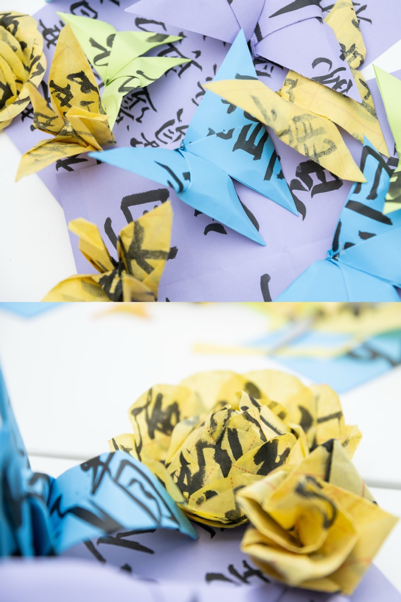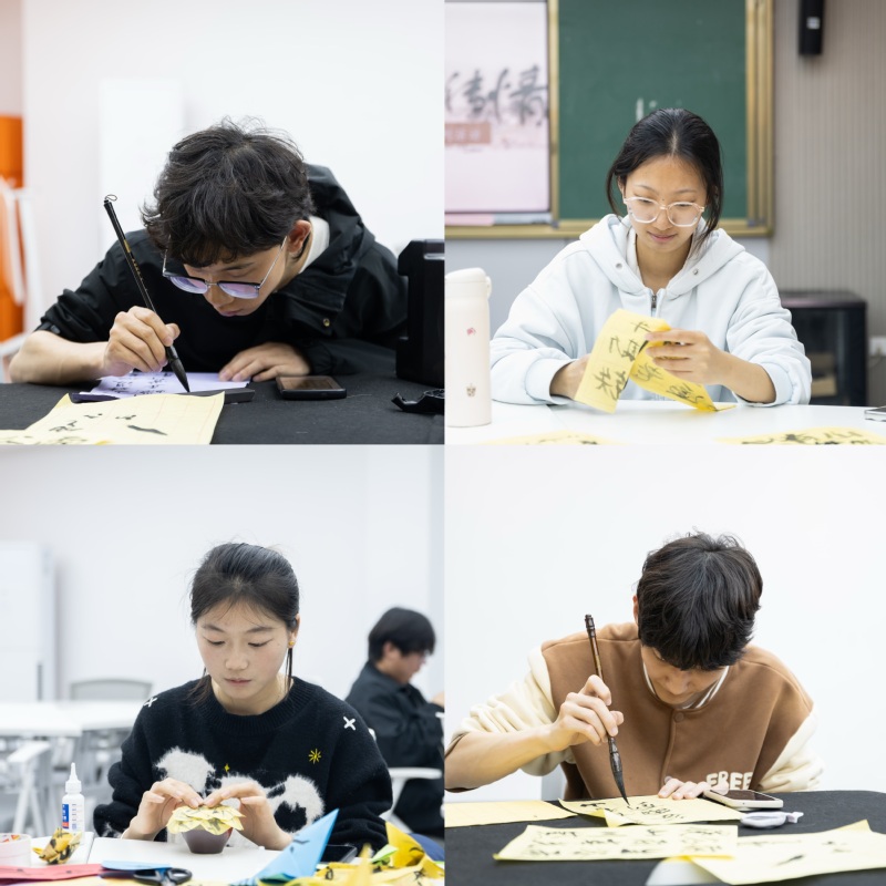 活動緊扣谷雨節氣文化,講解節氣由來與習俗,開展谷雨節氣主題書法創作,書寫詩詞與勵志寄語。在書法創作環節,現場備齊筆墨紙硯與谷雨主題詩詞、勵志寄語模板,同學們揮毫潑墨,書寫“雨潤萬物,學有所成”“不負春光,前程似錦”等美好祝愿,作品可裝裱成書簽、搭配干花裝飾,盡顯谷雨詩意。紙藝制作環節,大家發揮想象折出象征生機的紙蝴蝶、呼應牡丹意象的紙玫瑰,巧手匠心間,春日美好躍然紙上。完成的作品或自行留存,或張貼于“谷雨心愿墻”,一句句心愿、一件件手作,凝聚起同窗情誼與青春朝氣。